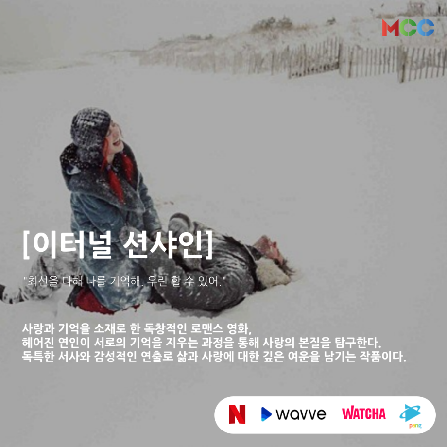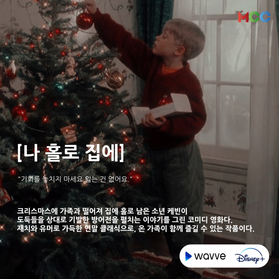 본문 시작 홈으로 MCC News 학과소개 교수소개 학과과정 MCC News MCC SNS 홈페이지가이드 학과 및 재학생 학과 및 재학생 교수 및 졸업생 미디어 정보통 학과 및 재학생 페이스북 트위터 프린트 "겨울 감성 가득! ❄ 추천 영화 6편" 미디어콘텐츠창작학과 2129 2025-01-22 춥고 포근한 계절, 마음까지 따뜻하게 해줄 영화들로 겨울을 더 특별하게 만들어보세요! ☃🎬 📽 1. 이터널 선샤인 📽 2. 패딩턴 📽 3. 패밀리 맨 📽 4. 노팅힐 📽 5. 맨체스터 바이 더 씨 📽 6. 나 홀로 집에 목록 이전학과잡지 <커뮤니케이션 통> 22호 발간! 다음 미콘창이라면 누구나! 필수 자격증 담당부서 : 미디어콘텐츠창작학과 담당자 : - 연락처 : 043-649-1741 최종수정일 : 2024-10-26 만족도조사 만족도 조사 이 페이지에서 제공하는 정보에 대하여 만족하시나요? 매우만족 만족 보통 불만족 매우불만족