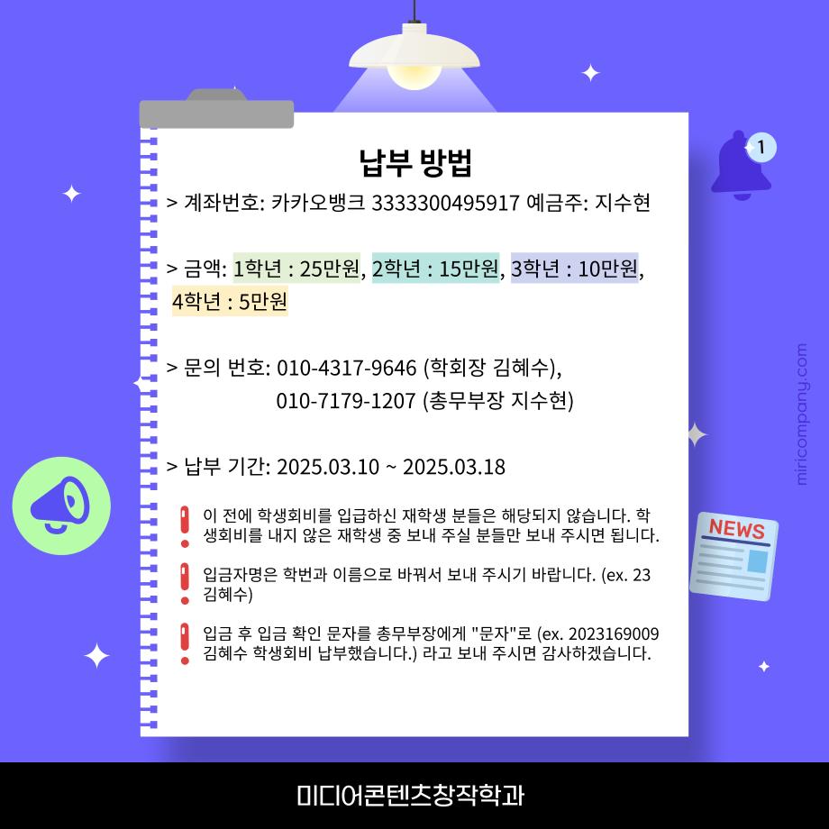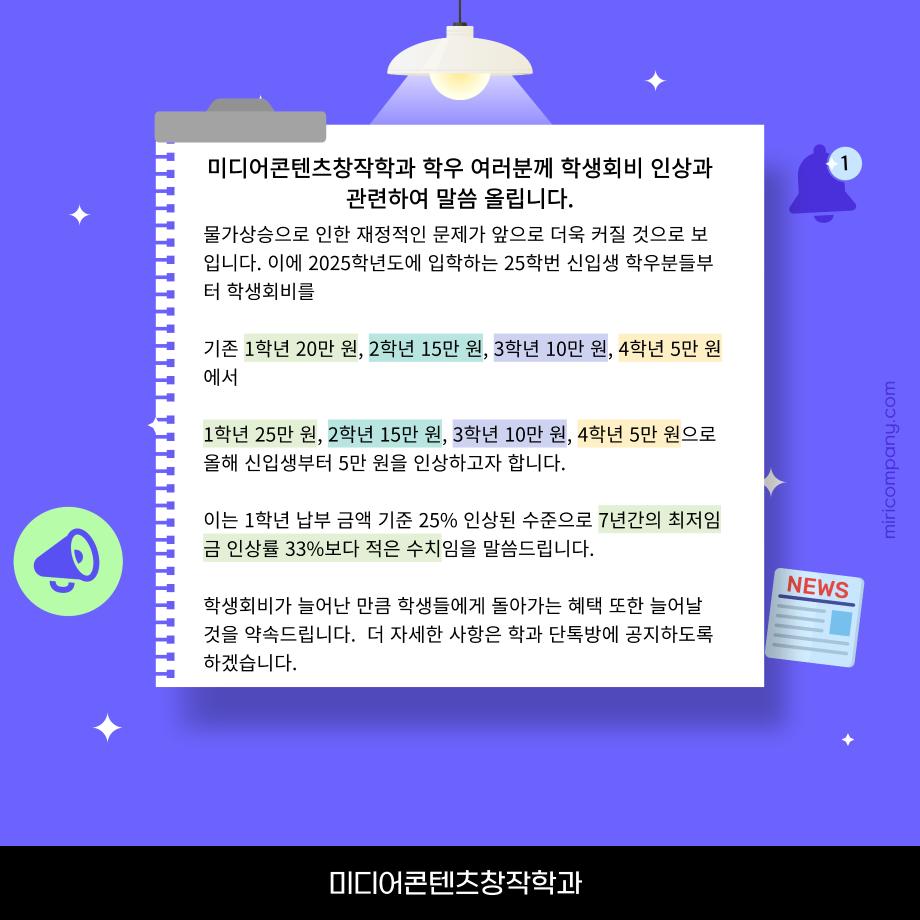 본문 시작 홈으로 MCC News 학과소개 교수소개 학과과정 MCC News MCC SNS 홈페이지가이드 학과 및 재학생 학과 및 재학생 교수 및 졸업생 미디어 정보통 학과 및 재학생 페이스북 트위터 프린트 ‼미디어콘텐츠창작학과 학생회비 안내 미디어콘텐츠창작학과 2463 2025-03-10 미디어콘텐텐츠창작학과에서 학생회비 인상과 납부 관련하여 안내드립니다. 더 자세한 사항은 과 단톡방을 통해 안내드리겠습니다. 문의사항이 있다면 카드뉴스에 적혀있는 학회장 또는 총무부장에게 연락바랍니다. 목록 이전‼️학생회 모집 안내 ‼️ 다음 🔥개총&신환회🎊 담당부서 : 미디어콘텐츠창작학과 담당자 : - 연락처 : 043-649-1741 최종수정일 : 2024-10-26 만족도조사 만족도 조사 이 페이지에서 제공하는 정보에 대하여 만족하시나요? 매우만족 만족 보통 불만족 매우불만족