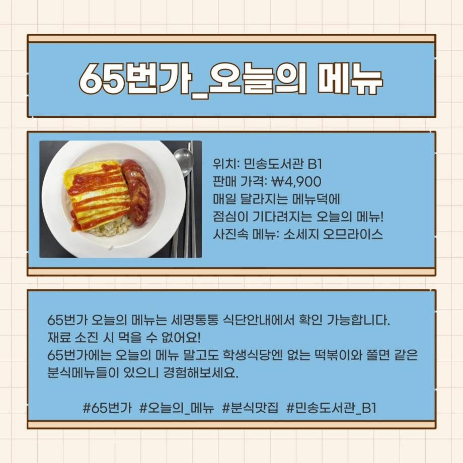 세명대학교의 자랑이라고도 할 수 있는 학생식당🏬과 65번가 식당🍴의 메뉴를 소개하는 내용을 담아보았습니다!! 😊