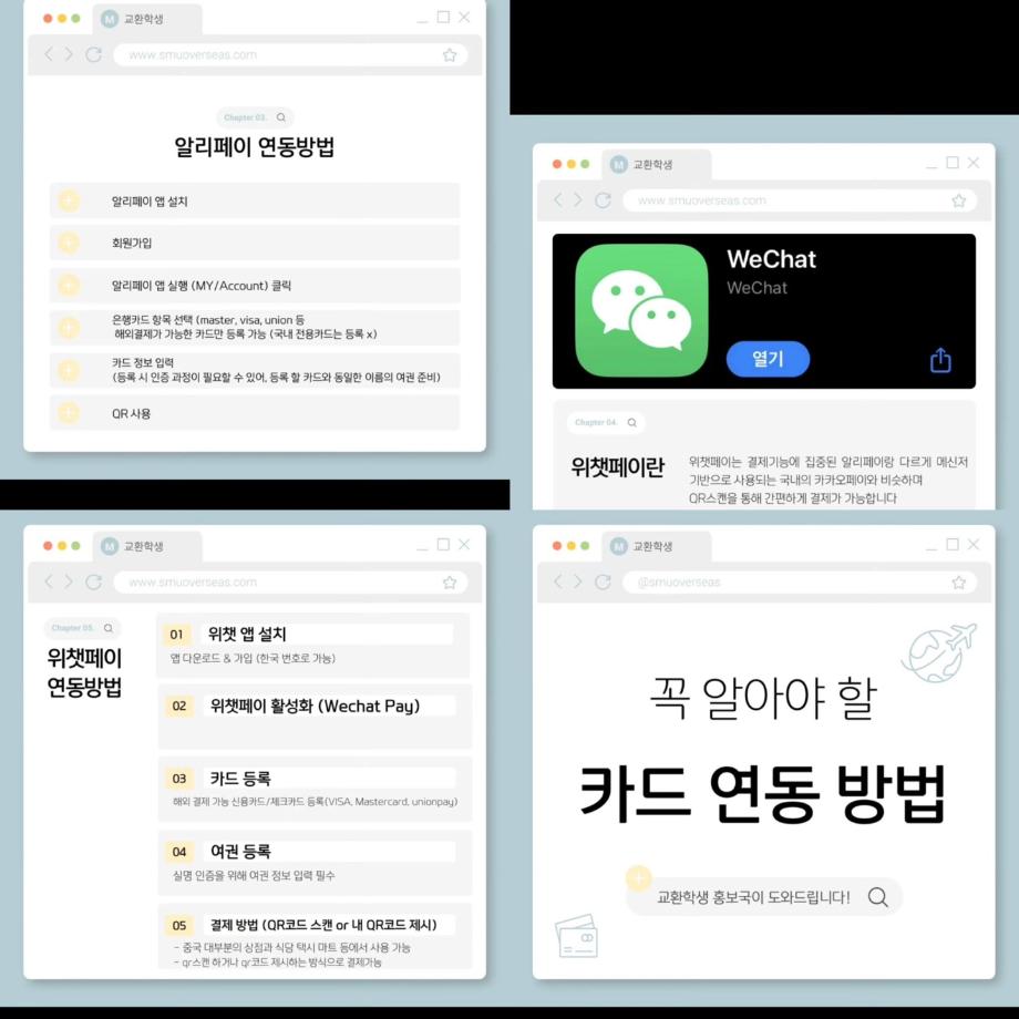 본문 시작 홈으로 커뮤니티 학과소개 입학정보 교과과정 커뮤니티 홈페이지가이드 포토갤러리 SNS 소통 공간 포토갤러리 공지사항 동아리 포토갤러리 페이스북 트위터 프린트 중국 카드 연동 방법 항공서비스학과 2309 2025-05-05 안녕하십니까 세명대학교 항공서비스학과 온라인 홍보국 💙푸르미르💙입니다. 오늘은 중국 교환학생에서 꼭 필요한 카드연동 방법 카드뉴스를 가져와보았습니다 😊 많은 도움이 되길 바랍니다!! 소중한 꿈을 품고 그 누구보다 높이 오를 여러분을 저희 "푸르미르" 가 항상 응원하겠습니다 ✈💙 궁금한 사항이 있으시다면 언제든지 SNS로 연락 주십시오 💬 #세명대학교 #항공서비스학과 #세명대 #항공과 #푸르미르 #카드연동 #카드 #중국 #교환학생 목록 이전5월 다이어리 다음 김포공항 국립박물관 견학